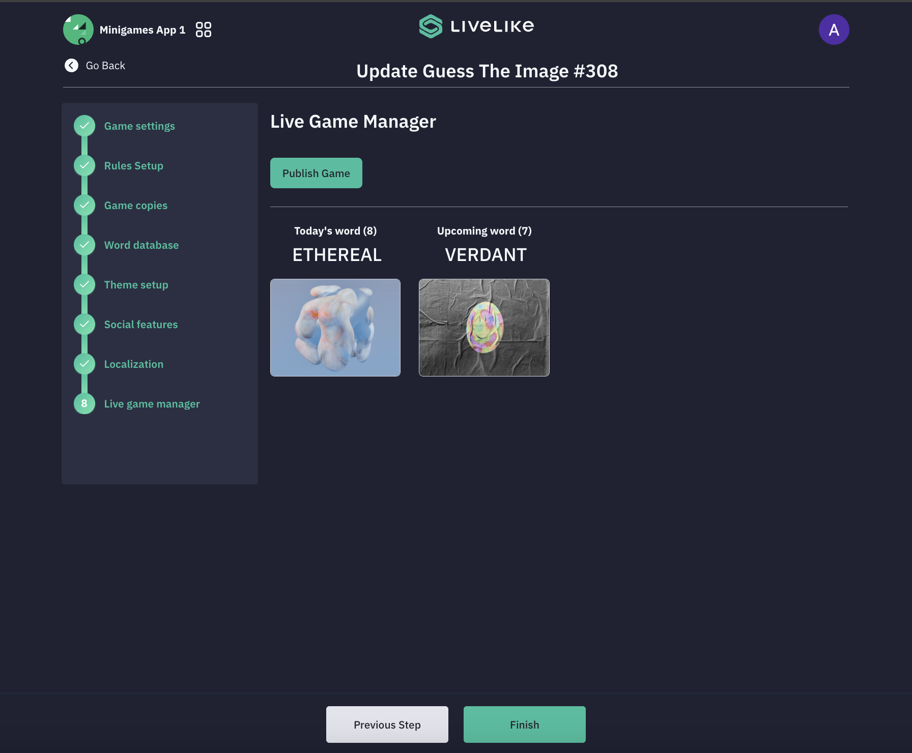 - This interface includes a "Publish Game" button for launching your game and displays the word and image timeline.