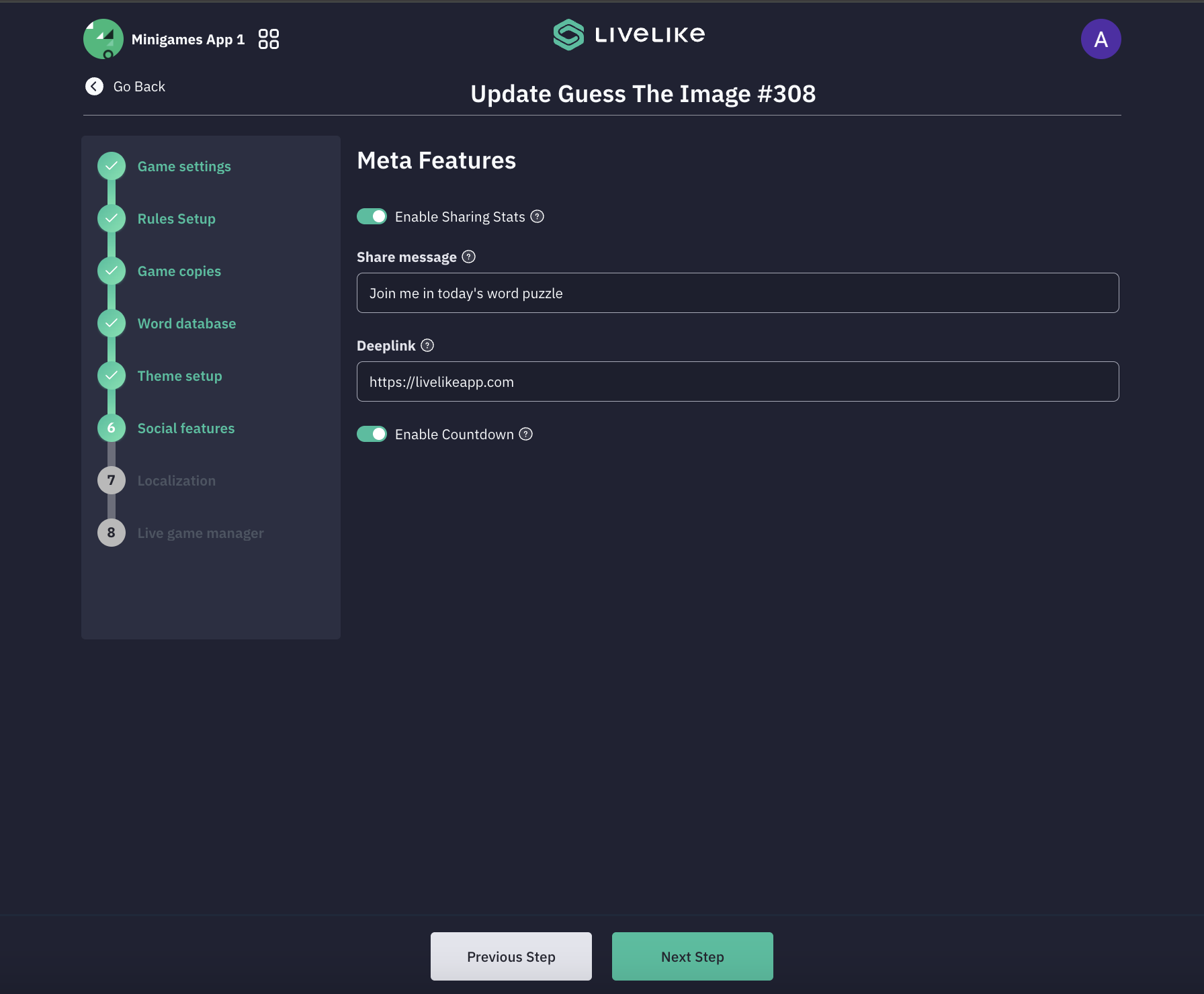 - Players can customize a share message (defaulted to "Join me in today's word puzzle") to invite others. The Deeplink feature allows configuration of deep linking functionality, along with a countdown toggle that displays a countdown when today's game ends but the new game hasn't started yet, indicating when the next game day begins.