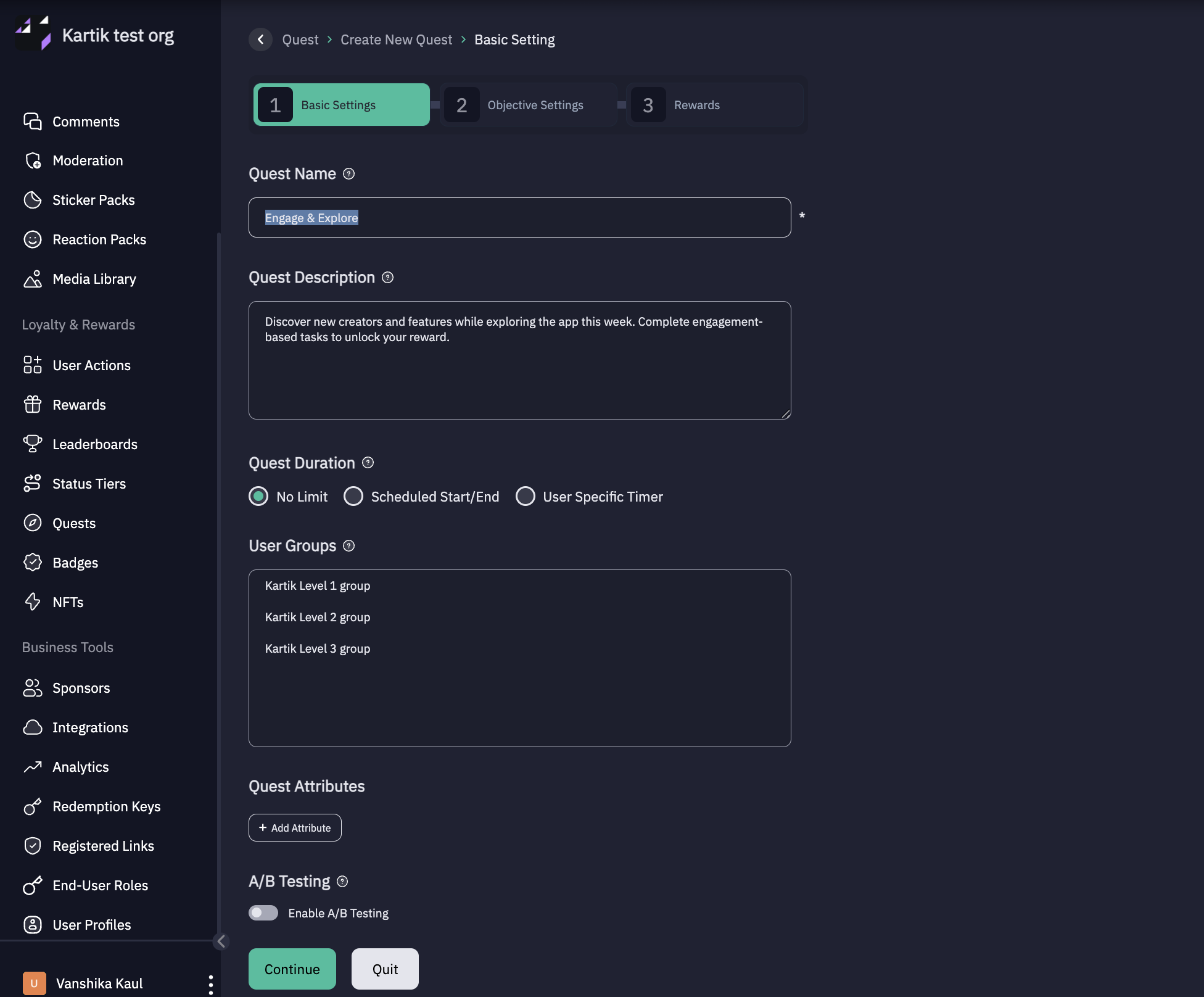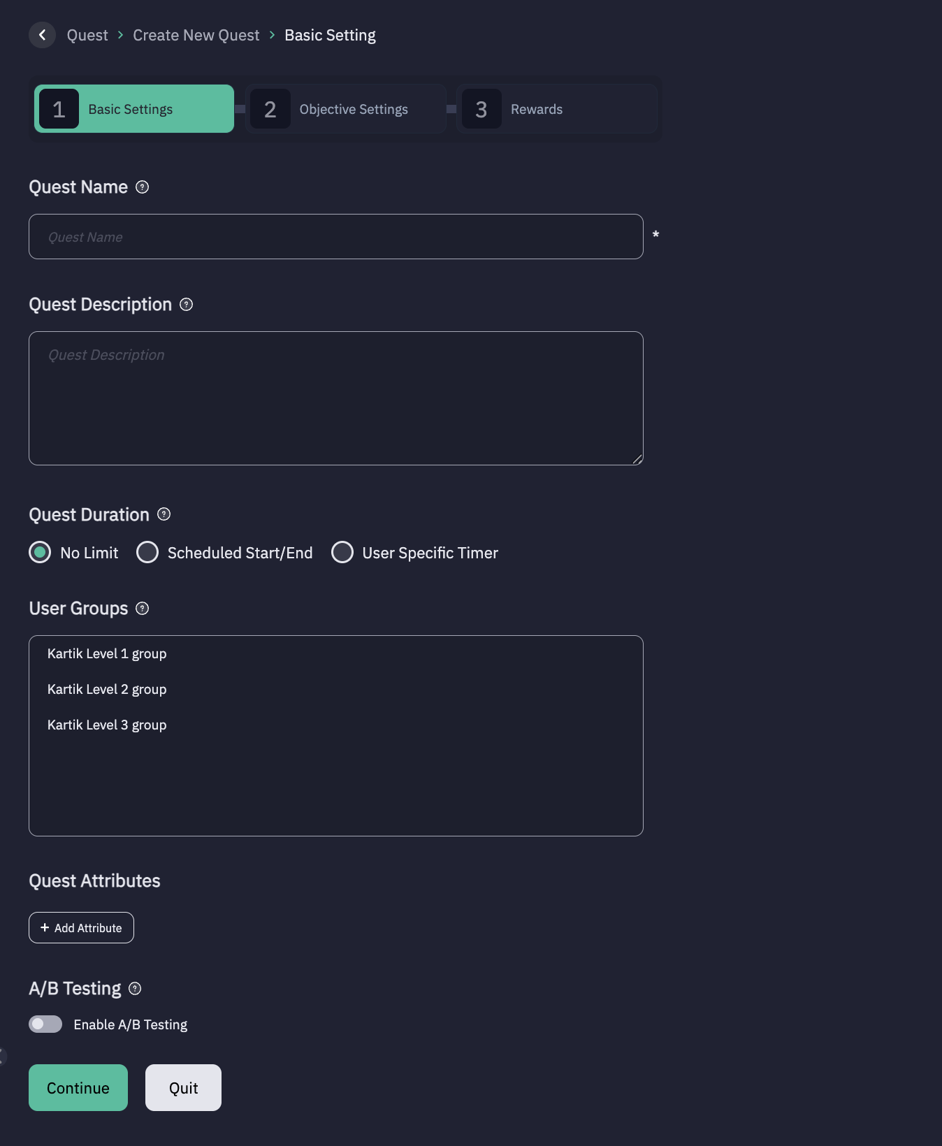 - Enable A/B Testing – Toggle ON to create an A/B Quest.