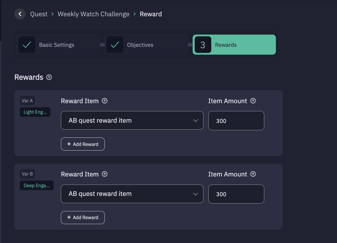 To add more rewards, click "+ Add Reward" under Var A and repeat.