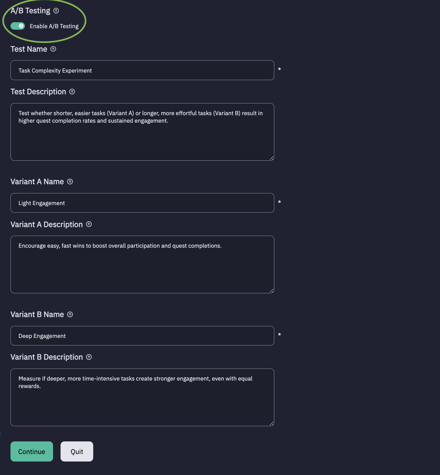 - Test Description (optional) – e.g., “Test whether shorter, easier tasks (Variant A) or longer, more effortful tasks (Variant B) result in higher quest completion rates and sustained engagement.”