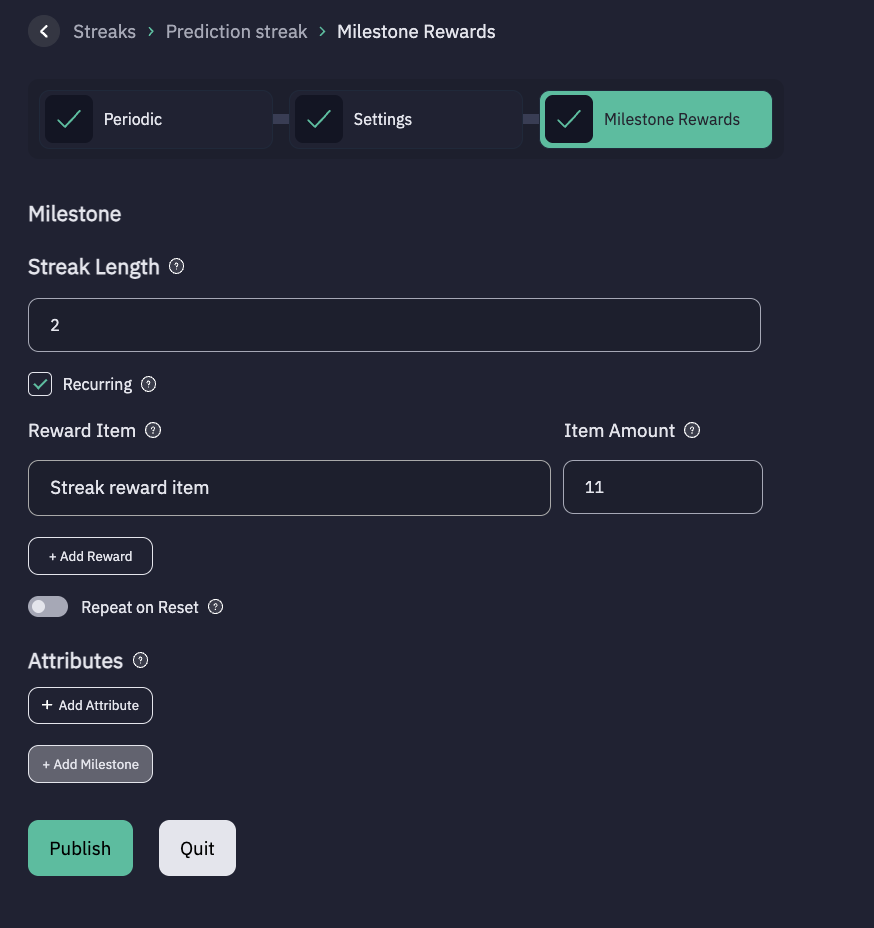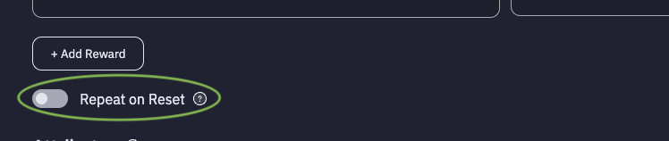 - Repeat on Reset - Toggle this option to allow or prevent users from earning reward for the same milestone again after they have achieved it once and their streak resets.