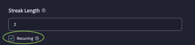 - Recurring - Enable this checkbox if users should receive the reward at defined streak length-interval (e.g., streak length 2 → rewards at 2, 4, 6, 8, 10…)