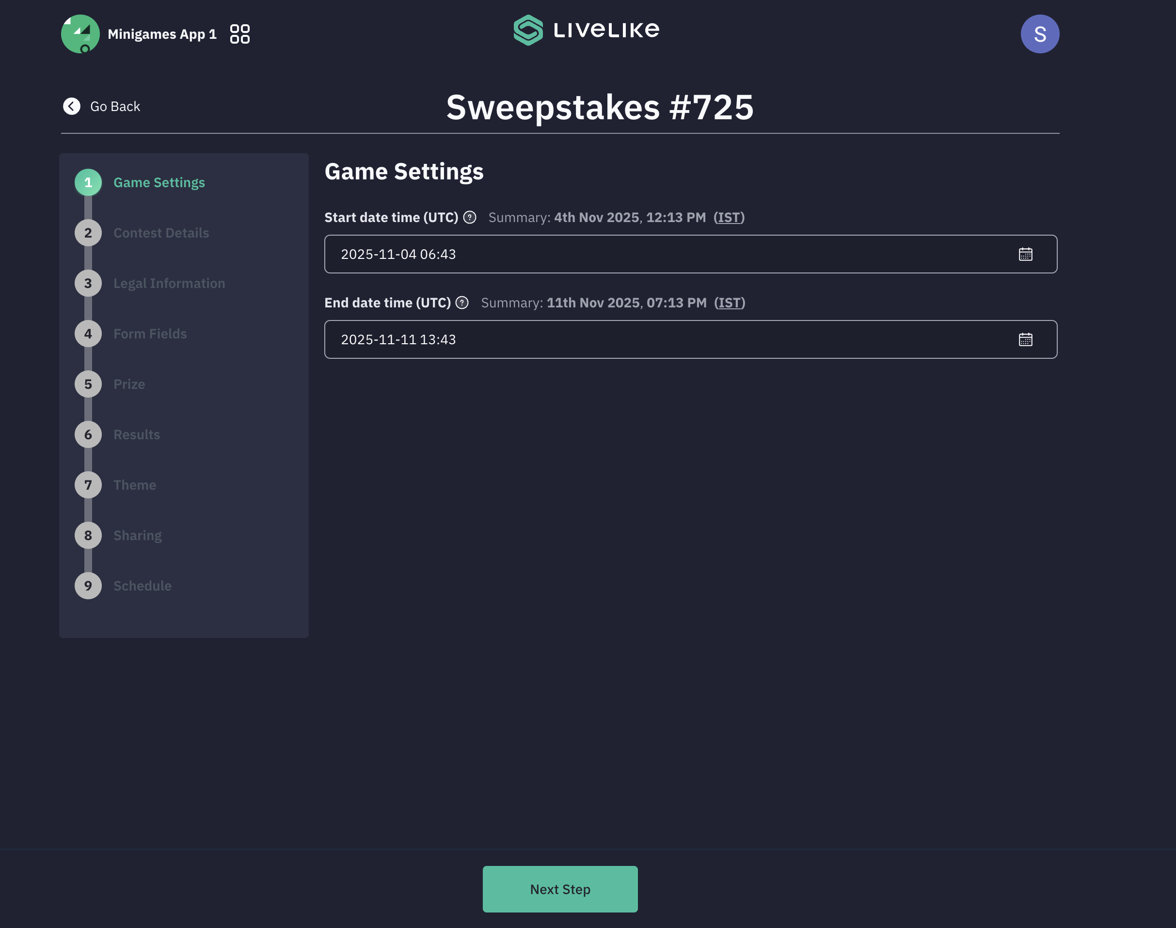 Configure the start date and time and the end date and time for the sweepstakes contest.