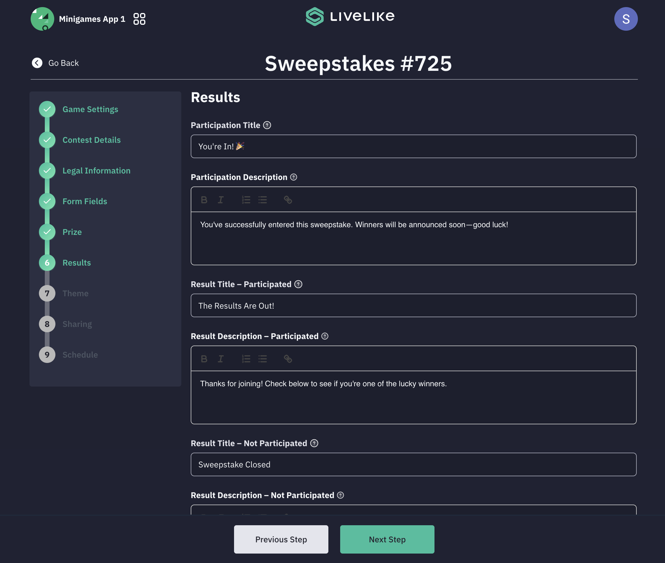 The Results section defines what participants see after they've entered the contest or when the contest has ended. It allows you to customize the display content for both participating and non-participating users.