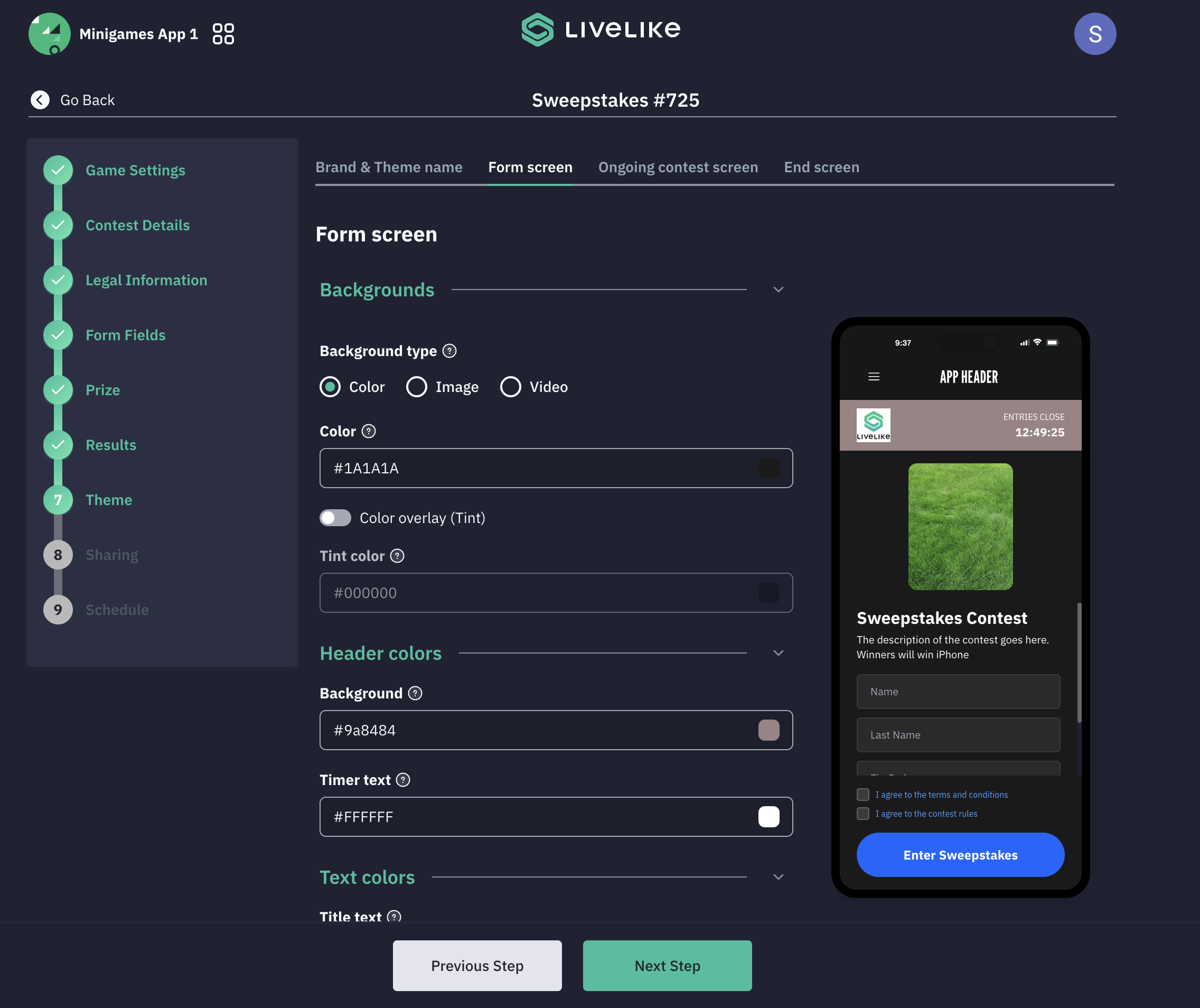 - Colors, background images, and text on Form Screen, Ongoing Contest Screen, and End Screen can be changed