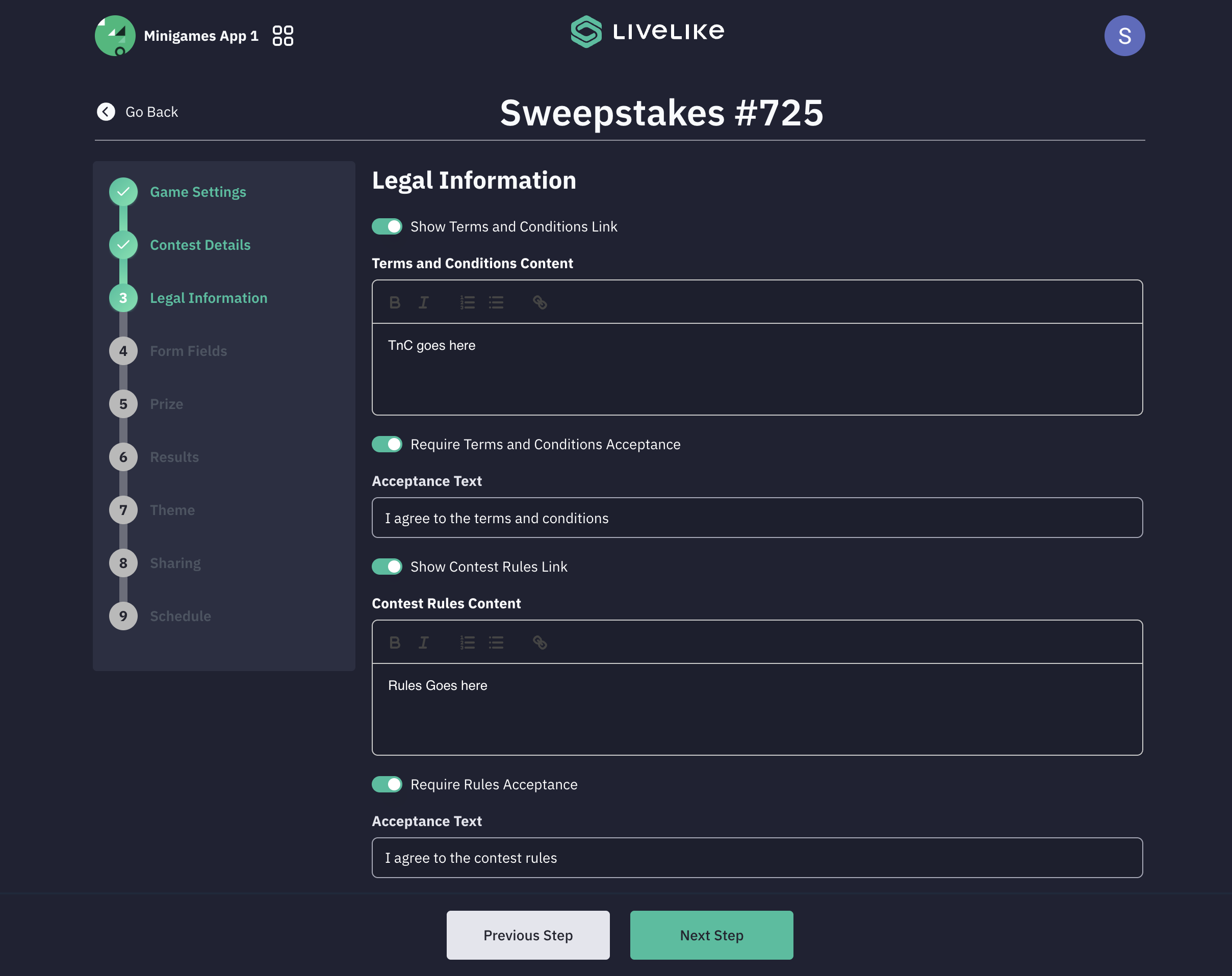 - Rules: Add contest rules along with acceptance text and enable a toggle to show the Rules acceptance checkbox